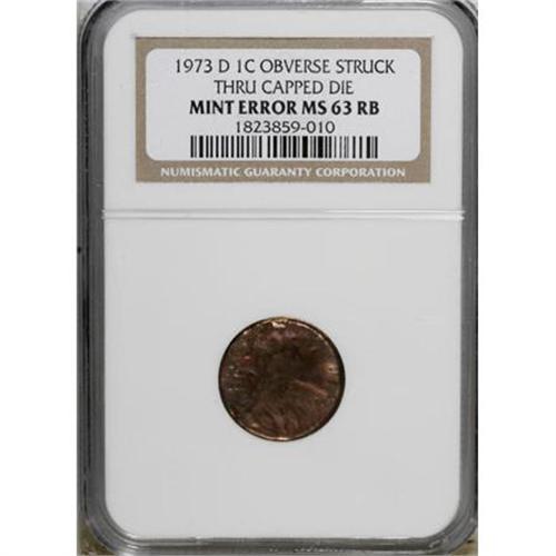 <B>1973 1C Lincoln Cent--Obverse struck thru, capped die--MS63 Red &Brown NGC.</B></I><BR><BR><B>Coin Engraver:</B> Victor D. Brenner<BR><BR><b>Shipping:</b> Coins & Currency (<a target="_blank" href="http://www.heritageauctions.com/common/shipping.php">view shipping information</a>)
