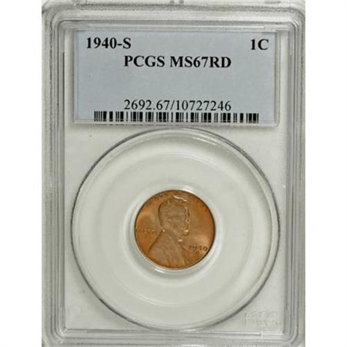<B>1940-S 1C MS67 Red PCGS.</B></I> PCGS Population (151/1). NGC Census: (642/0). Mintage: 112,940,000. Numismedia Wsl. Price for NGC/PCGS coin in MS67: $110. (#2692)<BR><BR><B>Coin Engraver:</B> Victor D. Brenner<BR><BR><b>Shipping:</b> Coins & Currency (<a target="_blank" href="http://www.heritageauctions.com/common/shipping.php">view shipping information</a>)