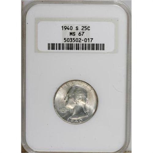 <B>1940-S 25C MS67 NGC.</B></I> NGC Census: (129/2). PCGS Population (30/1). Mintage: 8,244,000. Numismedia Wsl. Price for NGC/PCGS coin in MS67: $500. (#5813)<BR><BR><B>Coin Engraver:</B> John Flanagan<BR><BR><b>Shipping:</b> Coins & Currency (<a target="_blank" href="http://www.heritageauctions.com/common/shipping.php">view shipping information</a>\)