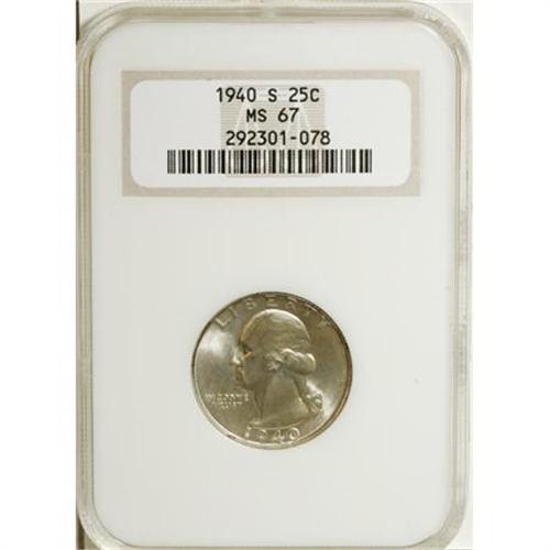 <B>1940-S 25C MS67 NGC.</B></I> A fully struck and highly lustrous Superb Gem, almost completely brilliant and exhibiting only a few tiny blemishes. Certified in a former generation holder.<BR><I>Ex: Colonel Carmine Penta Collection (Heritage, 3/03), lot 743.</B></I><BR><BR><B>Coin Engraver:</B> John Flanagan<BR><BR><b>Shipping:</b> Coins & Currency (<a target="_blank" href="http://www.heritageauctions.com/common/shipping.php">view shipping information</a>)