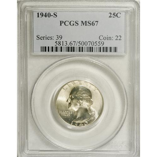 <B>1940-S 25C MS67 PCGS.</B></I> A touch of rose-gold in the obverse fields contributes to the exceptional eye appeal of this piece. The strike is robust, the luster intense. Population: 30 in 67, 1 finer (1/07).<BR><BR><b>Shipping:</b> Coins & Currency (<a target="_blank" href="http://www.heritageauctions.com/common/shipping.php">view shipping information</a>)