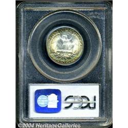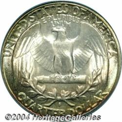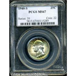 <B>1940-S<25C> MS67 PCGS.</B></I> Richly toned in mint-green, gold, and magenta hues, the surfaces are expectantly well struck for the assigned grade. A few small contact marks are detected on the principal obverse device. A frosty representative of this conditionally scarce S-mint issue. Population: 27 in 67, 1 finer (3/04). <BR><BR><B>Important notice:</B> Heritage usually auctions material at the rate of 200-250 lots per hour. On some occasions eBay Live bid software or the Internet may not be able to keep up with the pace of the auction. We recommend placing a realistic absentee bid now as insurance to avoid disappointment. Occasionally the auctioneer may eliminate or reject an eBay Live bid, and the auctioneer may also reopen a lot after the close of the eBay live bidding (usually because we missed an audience bid), and may reject your bid even if it shows you as the winning bidder. By bidding via eBay Live, you agree that Heritage may award the lot to another bidder at its sole discretion under the circumstances described above or any other reasonable circumstances. Since eBay bids are not shown to us until we open the lot on the floor, we treat those bids just like floor bids. In most cases the floor responds before the eBay bid is presented to us, due to Internet lag time, so for consistency we have made it a policy that floor bids are always considered first over tie eBay live bids. Also please note that all Heritage lots purchased through eBay Live carry a 20% Buyer's Premium. Please make sure you read the Terms and Conditions before you bid. </span></font></tr></table></td></tr></table>