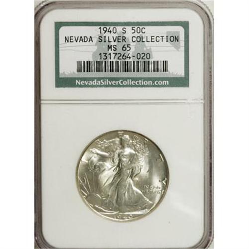 <B>1940-S 50C MS65 NGC.</B></I> Ex: Nevada Silver Collection. NGC Census: (729/132). PCGS Population (1133/287). Mintage: 4,550,000. Numismedia Wsl. Price for NGC/PCGS coin in MS65: $300. (#6610)<BR><BR><B>Coin Engraver:</B> Adolph A. Weinman<BR><BR><b>Shipping:</b> Coins & Currency (<a target="_blank" href="http://www.heritageauctions.com/common/shipping.php">view shipping information</a>\)