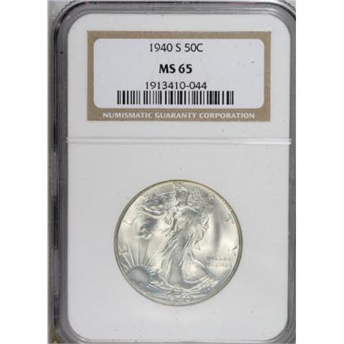 <B>1940-S 50C MS65 NGC.</B></I> NGC Census: (733/135). PCGS Population (1158/305). Mintage: 4,550,000. Numismedia Wsl. Price for NGC/PCGS coin in MS65: $310. (#6610)<BR><BR><B>Coin Engraver:</B> Adolph A. Weinman<BR><BR><b>Shipping:</b> Coins & Currency (<a target="_blank" href="http://www.heritageauctions.com/common/shipping.php">view shipping information</a>)