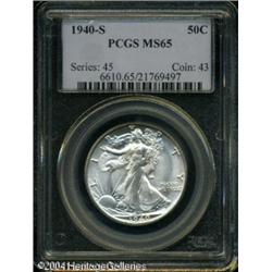1940-S 50C MS65 PCGS. Untoned with thick mint fros <B>1940-S 50C MS65 PCGS.</B></I> Untoned with thick mint frost on both sides and a soft strike. A carefully preserved coin with just a couple of small contact marks. Bright and flashy. <BR><BR><B>Important notice:</B> Heritage usually auctions material at the rate of 200-250 lots per hour. On some occasions eBay Live bid software or the Internet may not be able to keep up with the pace of the auction. We recommend placing a realistic absentee bid now as insurance to avoid disappointment. Occasionally the auctioneer may eliminate or reject an eBay Live bid, and the auctioneer may also reopen a lot after the close of the eBay live bidding (usually because we missed an audience bid), and may reject your bid even if it shows you as the winning bidder. By bidding via eBay Live, you agree that Heritage may award the lot to another bidder at its sole discretion under the circumstances described above or any other reasonable circumstances. Since eBay bids are not shown to us until we open the lot on the floor, we treat those bids just like floor bids. In most cases the floor responds before the eBay bid is presented to us, due to Internet lag time, so for consistency we have made it a policy that floor bids are always considered first over tie eBay live bids. Also please note that all Heritage lots purchased through eBay Live carry a 20% Buyer's Premium. Please make sure you read the Terms and Conditions before you bid. This lot is being auctioned in conjunction with a live floor auction by Heritage Galleries & Auctioneers. All final auction and invoice information will be supplied by Heritage Galleries & Auctioneers, and all other information should be considered preliminary. Lot:6203