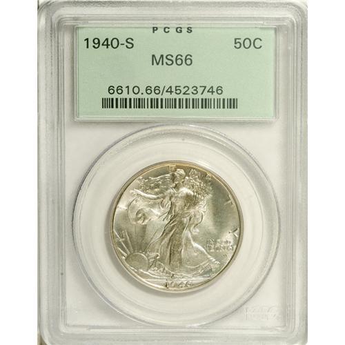 <B>1940-S 50C MS66 PCGS.</B></I> Softly lustrous with subtle lavender toning and a vertical streak of gold at the center of the obverse. Well struck and attractive. PCGS has graded only three pieces finer (12/06).<BR><BR><b>Shipping:</b> Coins & Currency (<a target="_blank" href="http://www.heritageauctions.com/common/shipping.php">view shipping information</a>)