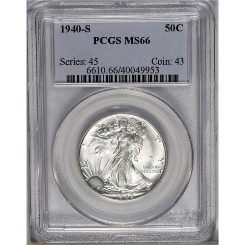 <B>1940-S<50C> MS66 PCGS.</B></I> This coin's immaculate surfaces are somewhat satiny and virtually untoned. This issue's infamous poor strike is noted on the hand, but this piece's detail is average for the issue at worst.<BR><I>From The Chicago-Ark Collection.</B></I>