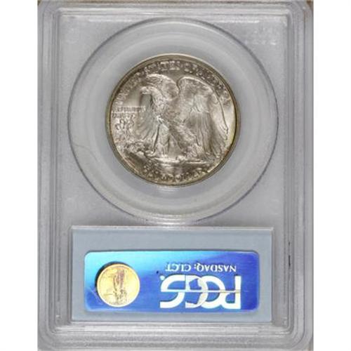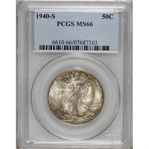 <B>1940-S 50C MS66 PCGS.</B></I> Aside from the usual lack of definition on Liberty's hand, this lustrous example has worthy detail. Blue, violet, and gold patina graces both sides. PCGS has certified just three coins finer (4/07). <BR><BR><b>Shipping:</b> Coins & Currency (<a target="_blank" href="http://www.heritageauctions.com/common/shipping.php">view shipping information</a>)