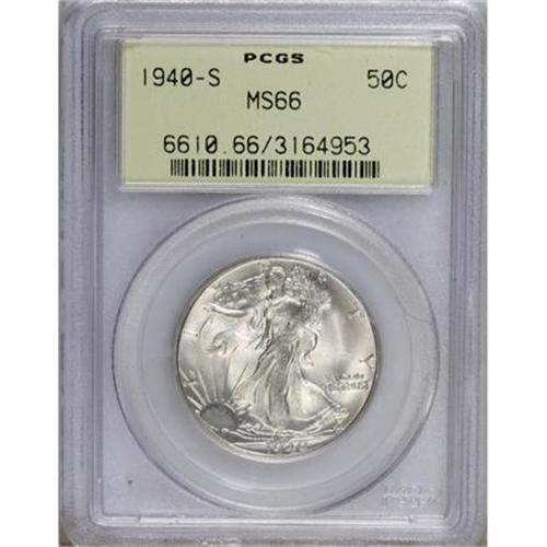 <B>1940-S 50C MS66 PCGS.</B></I> Lime and ice-blue tints grace this lustrous and virtually unabraded Premium Gem. The strike is above average for the mint, although the branch hand is blunt. Housed in an old green label holder.<BR><BR><b>Shipping:</b> Coins & Currency (<a target="_blank" href="http://www.heritageauctions.com/common/shipping.php">view shipping information</a>)