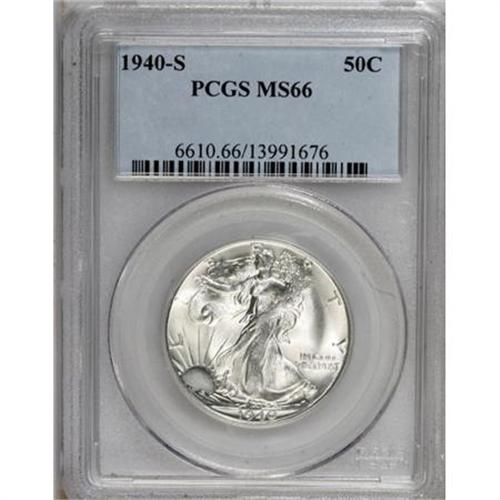 <B>1940-S 50C MS66 PCGS.</B></I> PCGS Population (299/3). NGC Census: (126/6). Mintage: 4,550,000. Numismedia Wsl. Price for NGC/PCGS coin in MS66: $1,125. (#6610)<BR><BR><B>Coin Engraver:</B> Adolph A. Weinman<BR><BR><b>Shipping:</b> Coins & Currency (<a target="_blank" href="http://www.heritageauctions.com/common/shipping.php">view shipping information</a>)