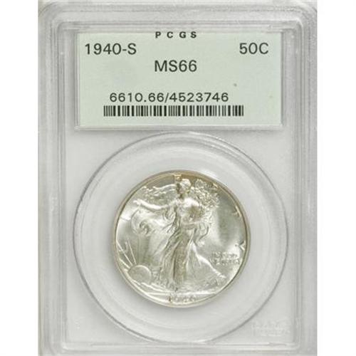 <B>1940-S 50C MS66 PCGS.</B></I> The highly lustrous surfaces of this Premium Gem display faint whispers of violet and champagne-gold color. Sharply struck, with especially well incised gown lines. A small milling mark in the right obverse field is mentioned for complete accuracy. Housed in a green-label holder.<BR><BR><B>Coin Engraver:</B> Adolph A. Weinman<BR><BR><b>Shipping:</b> Coins & Currency (<a target="_blank" href="http://www.heritageauctions.com/common/shipping.php">view shipping information</a>)