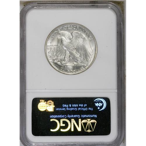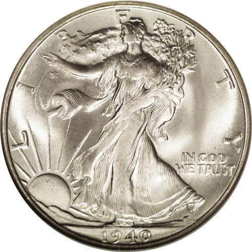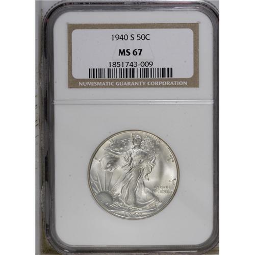<B>1940-S<50C> MS67 NGC.</B></I> This beautiful Superb Gem is remarkably free from contact. The obverse is immaculate, as is the reverse field, and it takes extreme patience and a strong loupe to finally locate a few minuscule ticks on the eagles' extremities. Satin luster and a hint of olive-gold and steel-blue toning combine for exquisite eye appeal. The branch hand is soft, and the cheek and upper skirt lines lack absolute detail, but the strike is above average for this San Francisco issue. As of (9/06), NGC and PCGS combined have certified eight pieces as MS67, with none finer.
