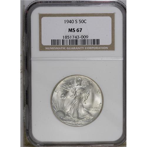 <B>1940-S 50C MS67 NGC.</B></I> This beautiful Superb Gem is remarkably free from contact. The obverse is immaculate, as is the reverse field, and it takes extreme patience and a strong loupe to finally locate a few minuscule ticks on the eagles' extremities. Satin luster and a hint of olive-gold and steel-blue toning combine for exquisite eye appeal. The branch hand is soft, and the cheek and upper skirt lines lack absolute detail, but the strike is above average for this San Francisco issue. As of (11/06), NGC and PCGS combined have certified eight pieces as MS67, with none finer.<BR><BR><b>Shipping:</b> Coin/Currency (<a target="_blank" href="http://www.heritageauctions.com/common/shipping.php">view shipping information</a>)