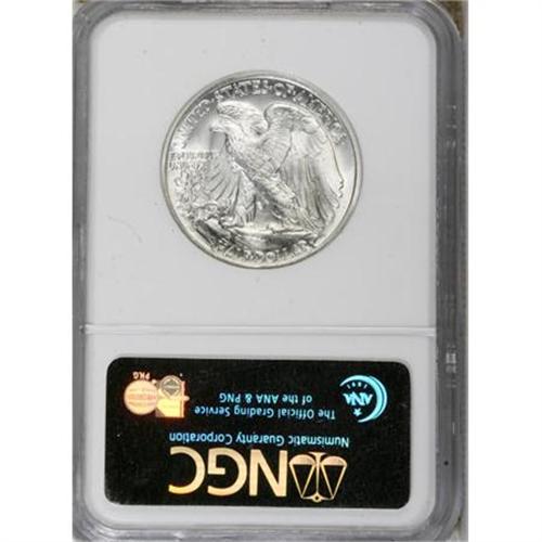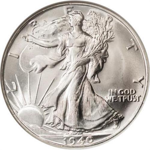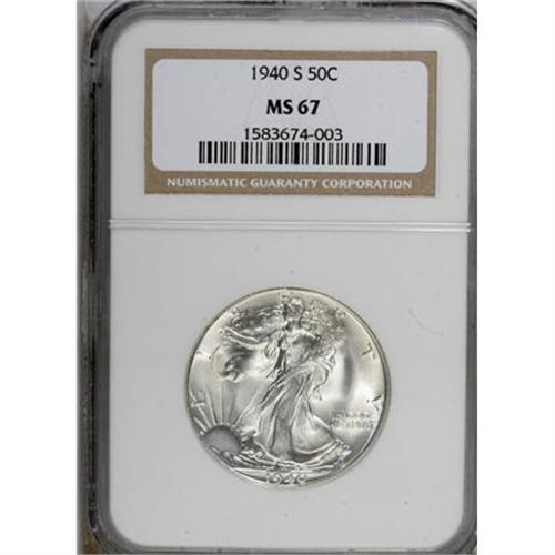 <B>1940-S 50C MS67 NGC.</B></I> An amazing example with fresh silver luster and frosty white surfaces on both sides. Every individual design element is boldly rendered, and the surfaces are just shy of perfect. NGC has only handed out the MS67 grade to a '40-S Walker six times, probably representing just two or three coins. Census: 6 in 67, 0 finer (10/07).<BR><BR><B>Coin Engraver:</B> Adolph A. Weinman<BR><BR><b>Shipping:</b> Coins & Currency (<a target="_blank" href="http://www.heritageauctions.com/common/shipping.php">view shipping information</a>)