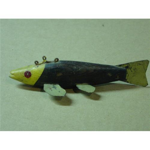 I HAVE NO IDEA WHO CARVED THIS, BUT HE DID A FINE JOB, IT HAS TRIPLE EYE HANGERS AT THE TOP FOR HOLDING THE LINE, THE EYES ARE MADE FROM SOME TYPE OF RED MATERIAL TACKS,THE MOUTH HAS BEEN CARVED,THERE ARE TWO WEIGHTS INSERTED INTO THE UNDERSIDE,YOU CAN MAKE OUT THE WOOD ( OAK ) FROM LIGHT PAINT WEAR, THIS DECOY WOULD MAKE A GREAT ADDITION TO ANY COLLECTION.