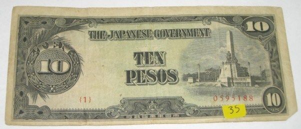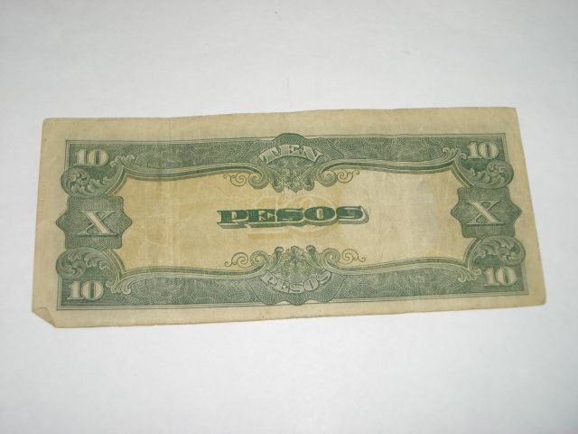 1940'S JAPANESE WW II OCCUPATIONAL 10 TEN PESOS BILL SERIAL # 0595188 *RARE NICE NOTE*!! ***Coin, Currency & All Items Listed in this auction - Grades, Conditions and Values are not Safe Deposit Coins LLC Responsibilty. Grades, Condition and Values are determined by Consigner(s) & Buyers ONLY***