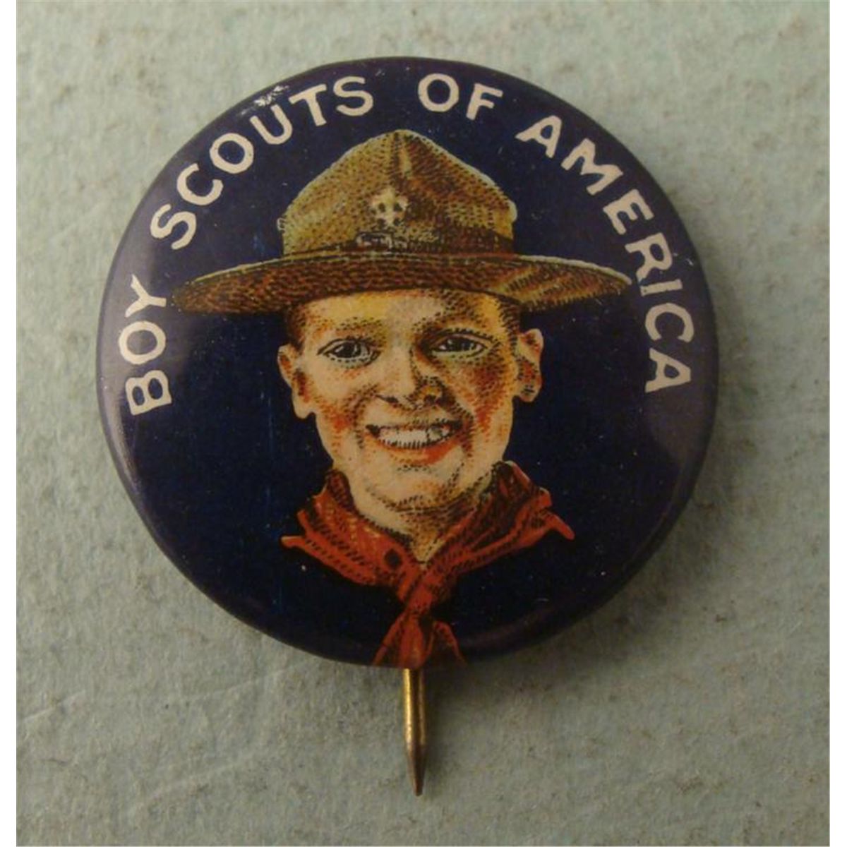 THIS 1940'S ORIGINAL "BOY SCOUTS OF AMERICA" PIN BACK BUTTON PICTURING A BOY SCOUT IN CAMPAIGN HAT IN FRONT. *