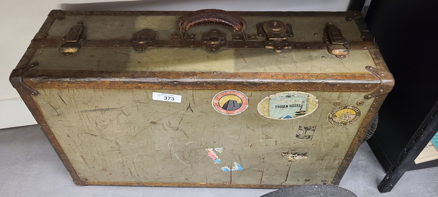 1940'S TRAVEL TRUNK- HAS ORIGINAL WORLD HOTEL DECALS