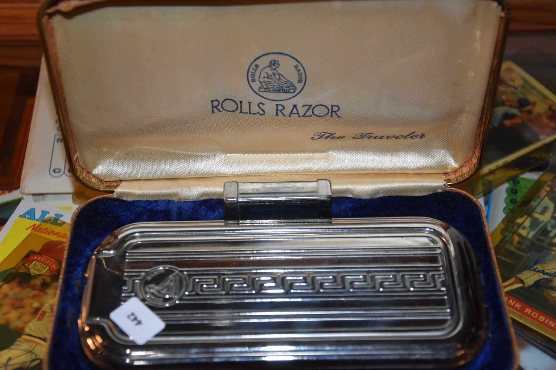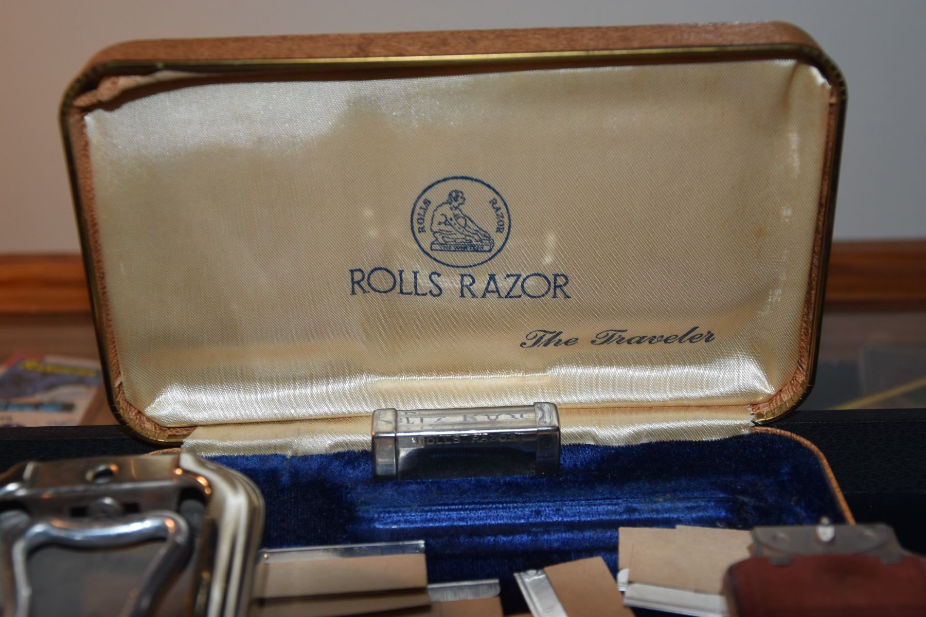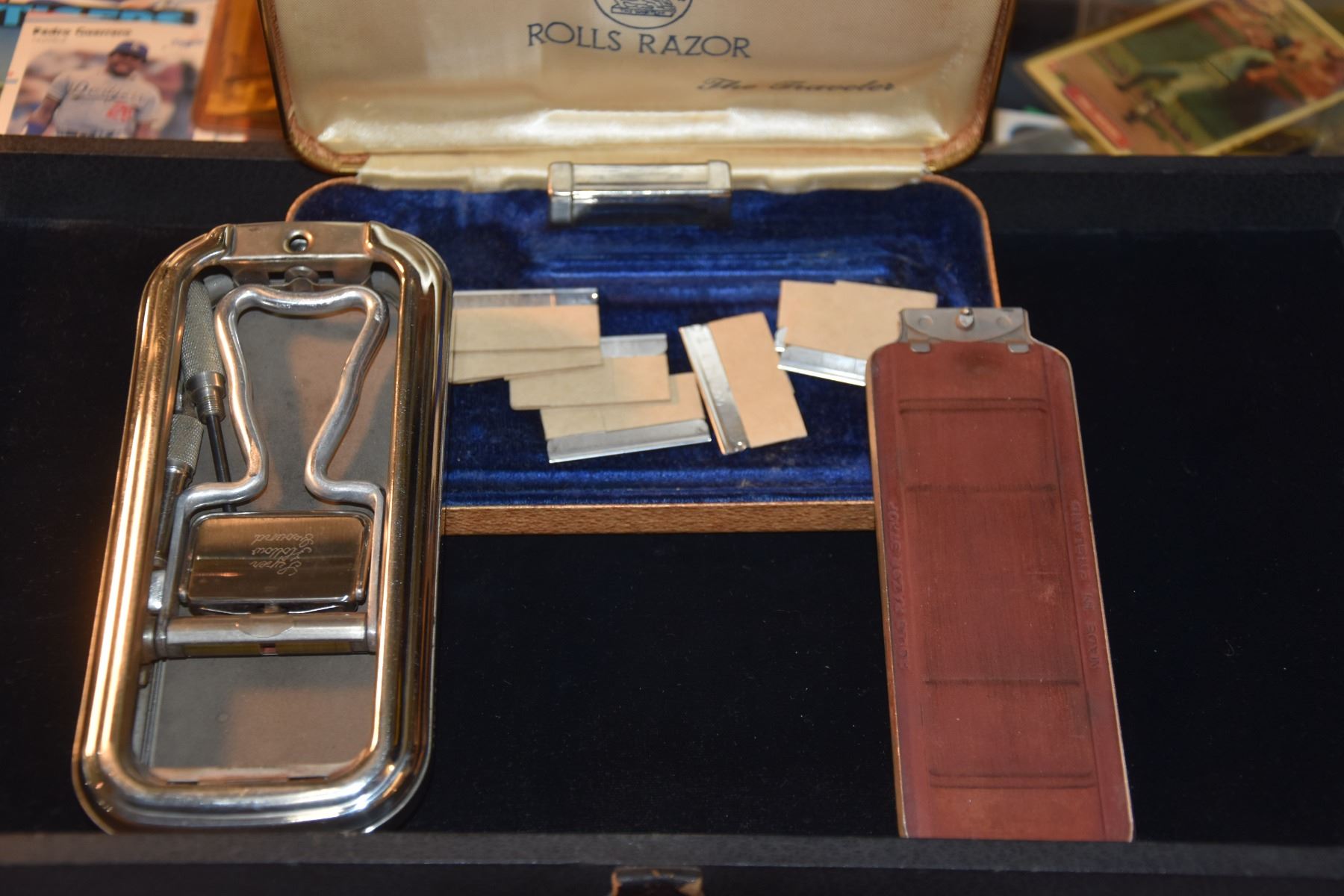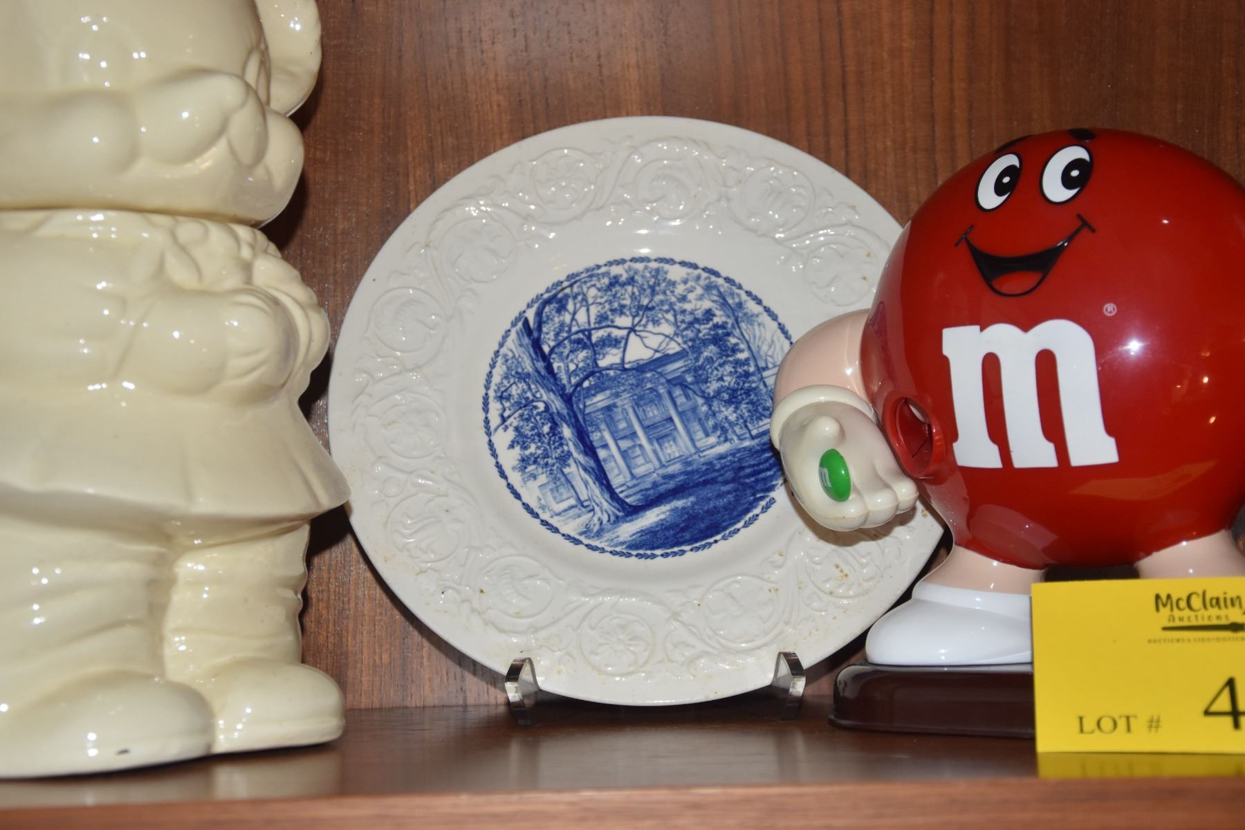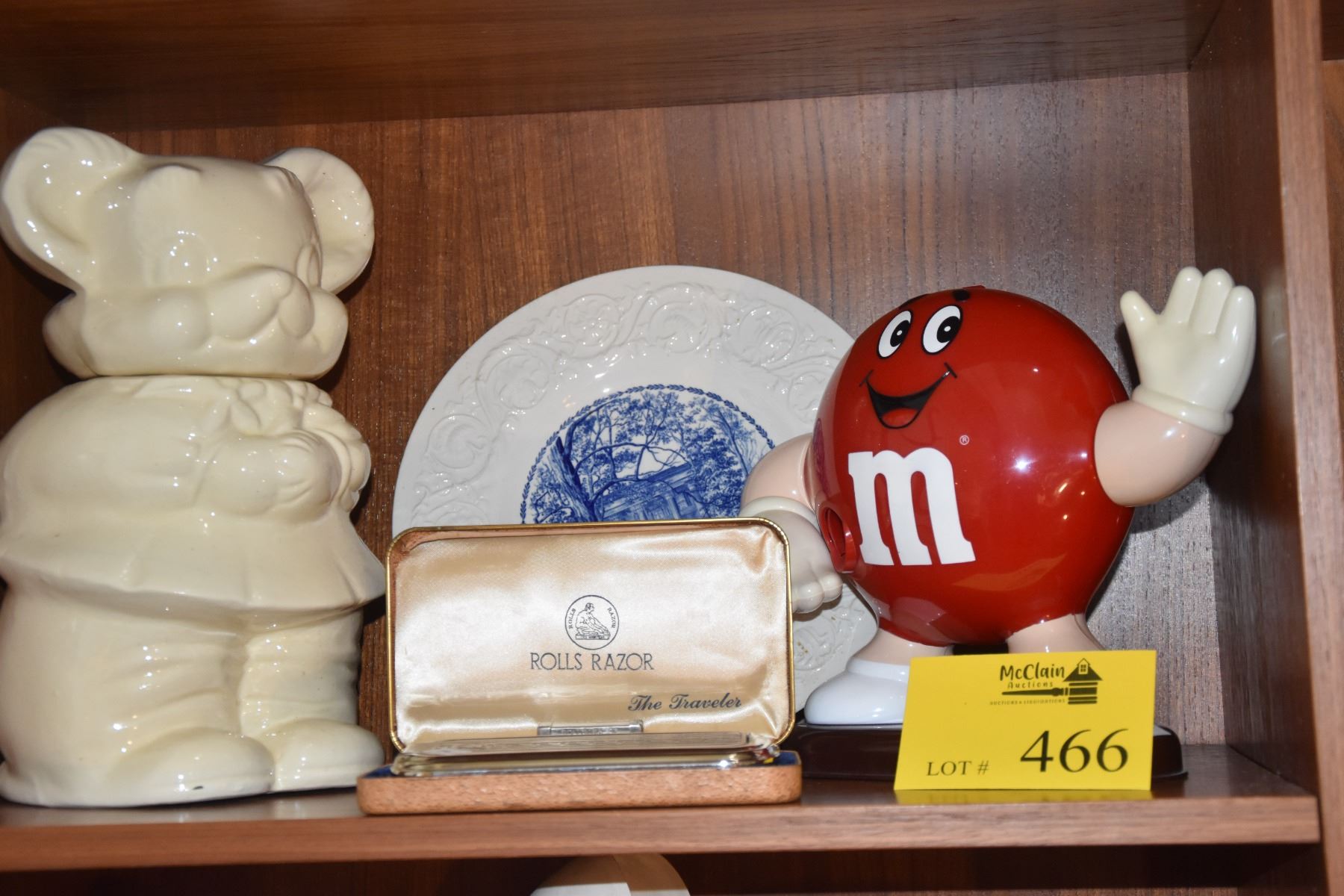 1940'S TURNABOUT COOKIE JAR, ROLLS RAZOR IN CASE, M & M DISPENSER & WEDGWOOD PLATE (4 PCS)
