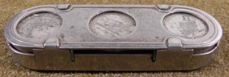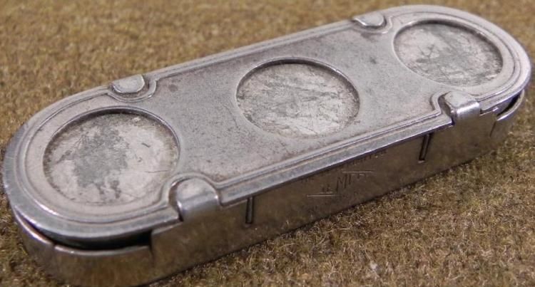 1940'S VINTAGE TOKEN/CHANGE HOLDER-SPRING TENSION-3 SLOTS-MKD:EMCO NEWARK, NJSTAINLESS STEEL--SIZE: 2 1/4 X 3/4"