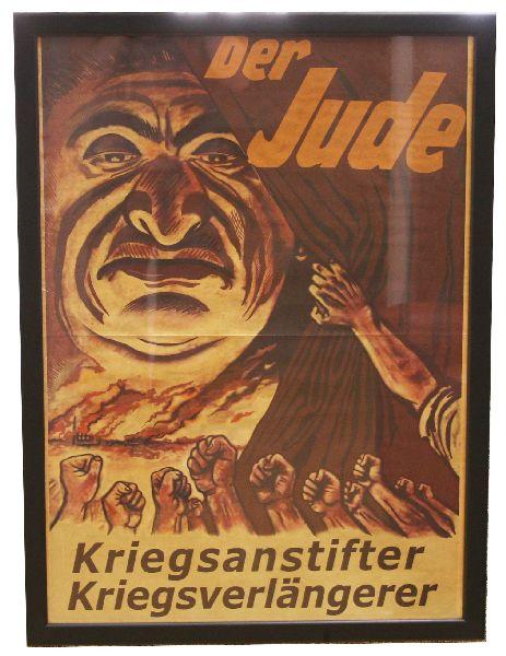 Early 1940's framed 25.5x34.5 inch poster by H. Mjolnig. Poster depicts a inflammatory depiction of a Jewish person over a burning city skyline and raised fists. Text translates to "The Jew/ the inciter of the war/ the prolonger of the war". Overall very good condition with heavy fold across the center and light folds around margins.