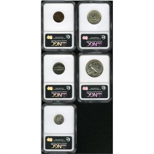 <B>1940<img border='0' src='http://www.heritagecoins.com/images/star.gif' width=10 height=10>ET> Proof Set PR64 to PR66 NGC.</B></I> The set contains: <B>cent PR64 Red and Brown,</B></I> orange-copper with patches of olive and mahogany; <B>nickel PR64,</B></I> pale blue patina with gold-toned devices and carbon flecks on both sides; <B>dime PR65,</B></I> moderately reflective with hazy patina; <B>quarter PR65,</B></I> champagne patina with good mirrors; and <B>half PR66,</B></I> deeply reflective with mustard-yellow toning at the periphery.