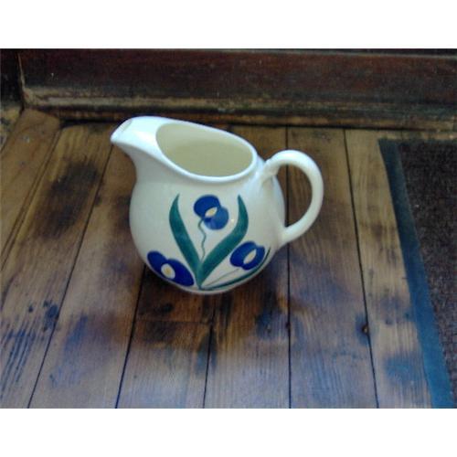 Here is a lovely example of a water jug in the Blue Crocus pattern, a stunning mix of blue and yellow flowers on an ivory background. The design, which resembles Southern Potteries' Blue Ridge designs, is free-hand decoration (hand-painted) underglaze technique, meaning that the decoration is made before the glaze is applied. The design is on both sides of the jug. Because of the free-hand approach, perfection in execution is not expected--there are a few tufts of color apart from the flowers themselves. This water jug is in excellent condition.