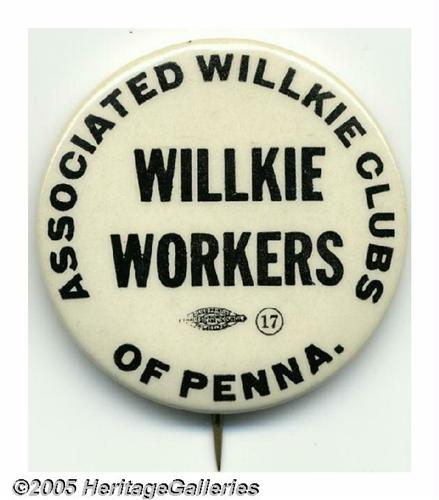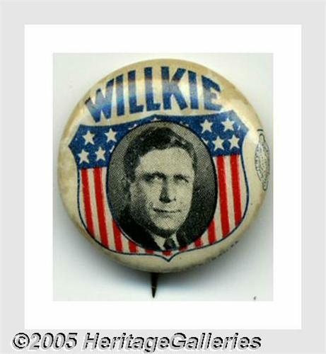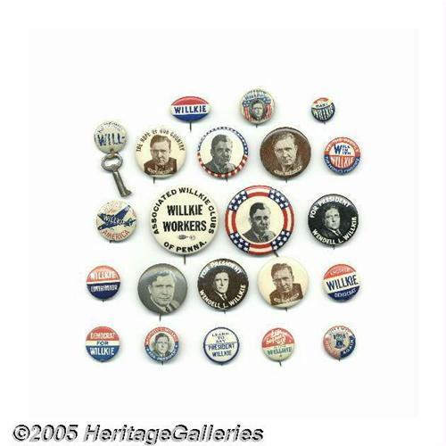 <B>1940 Wendell Willkie Button Group Lot</B></I> Twenty-two pieces, as shown, all but a couple in excellent or better condition. Please see our web site for additional images. Total individual fair retail value around $275. Sizes 3/4" to 1 3/4". Lot:263