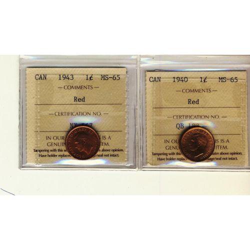 1940 and 1943 1¢ ICCS MS65 red, both coins have full lustre and clean fields