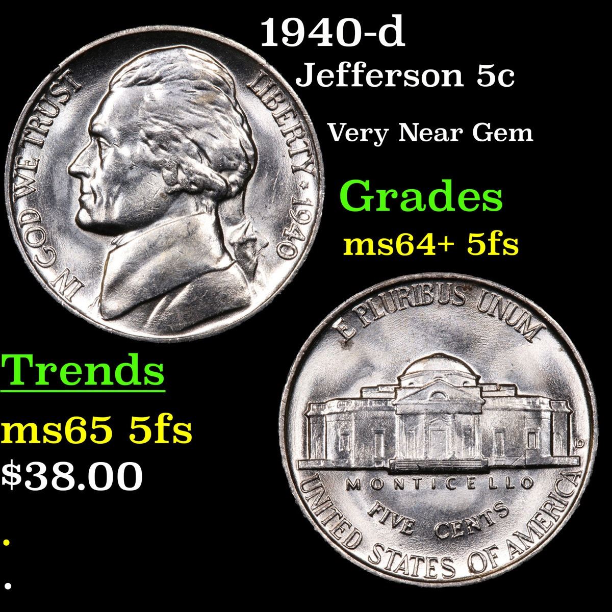 1940-d . Very Near Gem Jefferson Nickel 5c Grades Choice Unc+ 5fs.