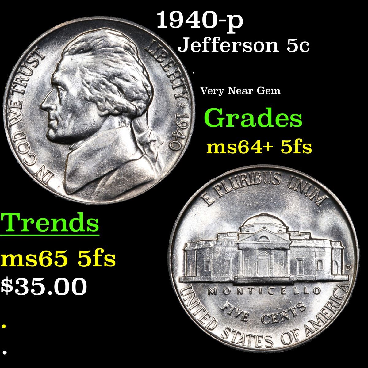 1940-p . Very Near Gem Jefferson Nickel 5c Grades Choice Unc+ 5fs.