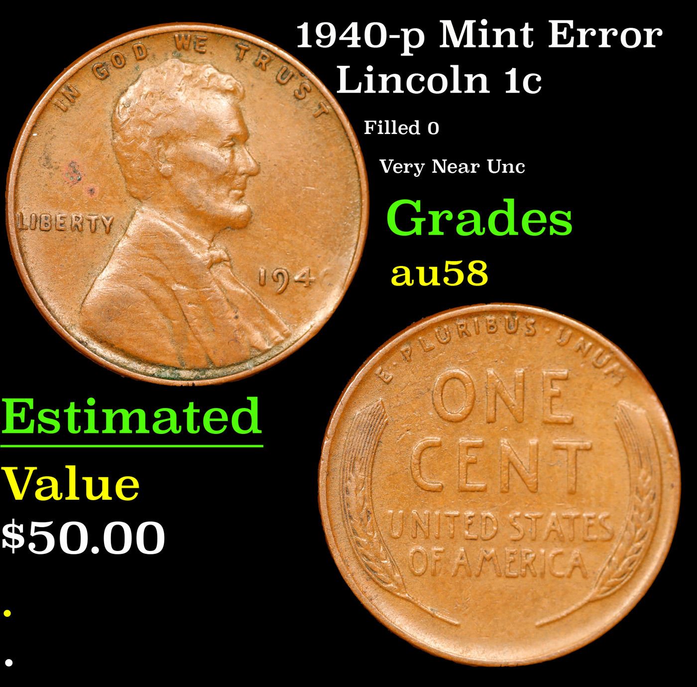 1940-p Mint Error Lincoln Cent 1c Grades Choice AU/BU Slider.
