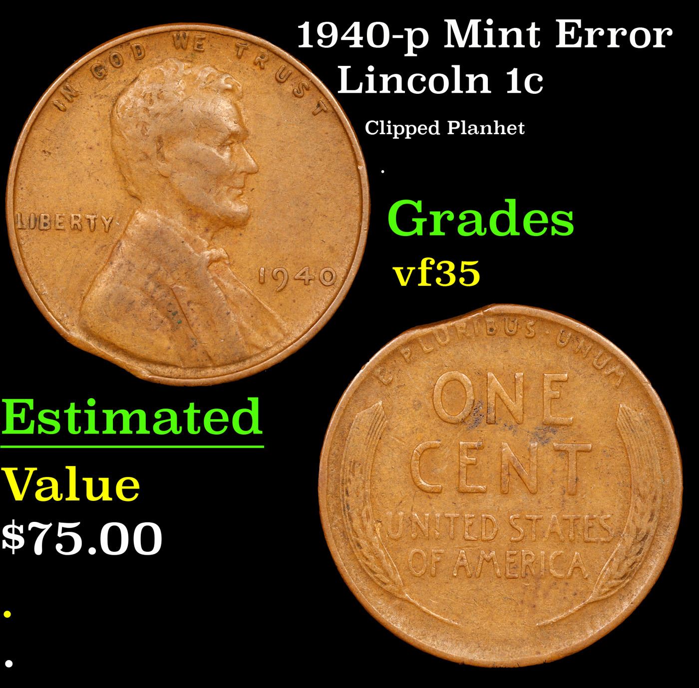 1940-p Mint Error Lincoln Cent 1c Grades vf++.