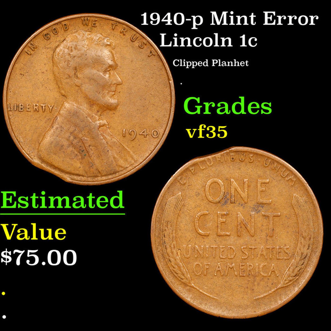 1940-p Mint Error Lincoln Cent 1c Grades vf++.