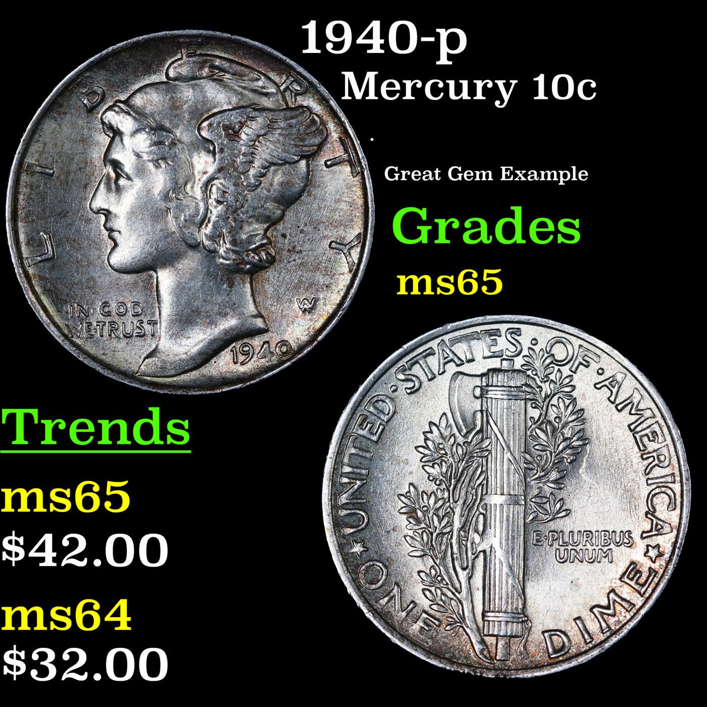 1940-p Mercury Dime 10c Grades GEM Unc.
