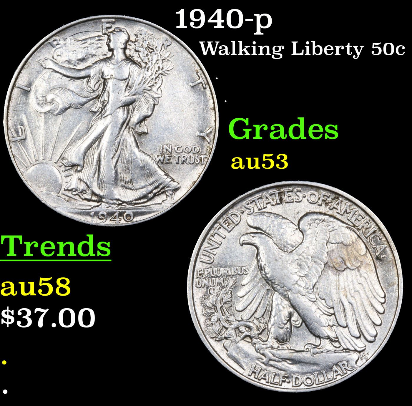 1940-p Walking Liberty Half Dollar 50c Grades Select AU.
