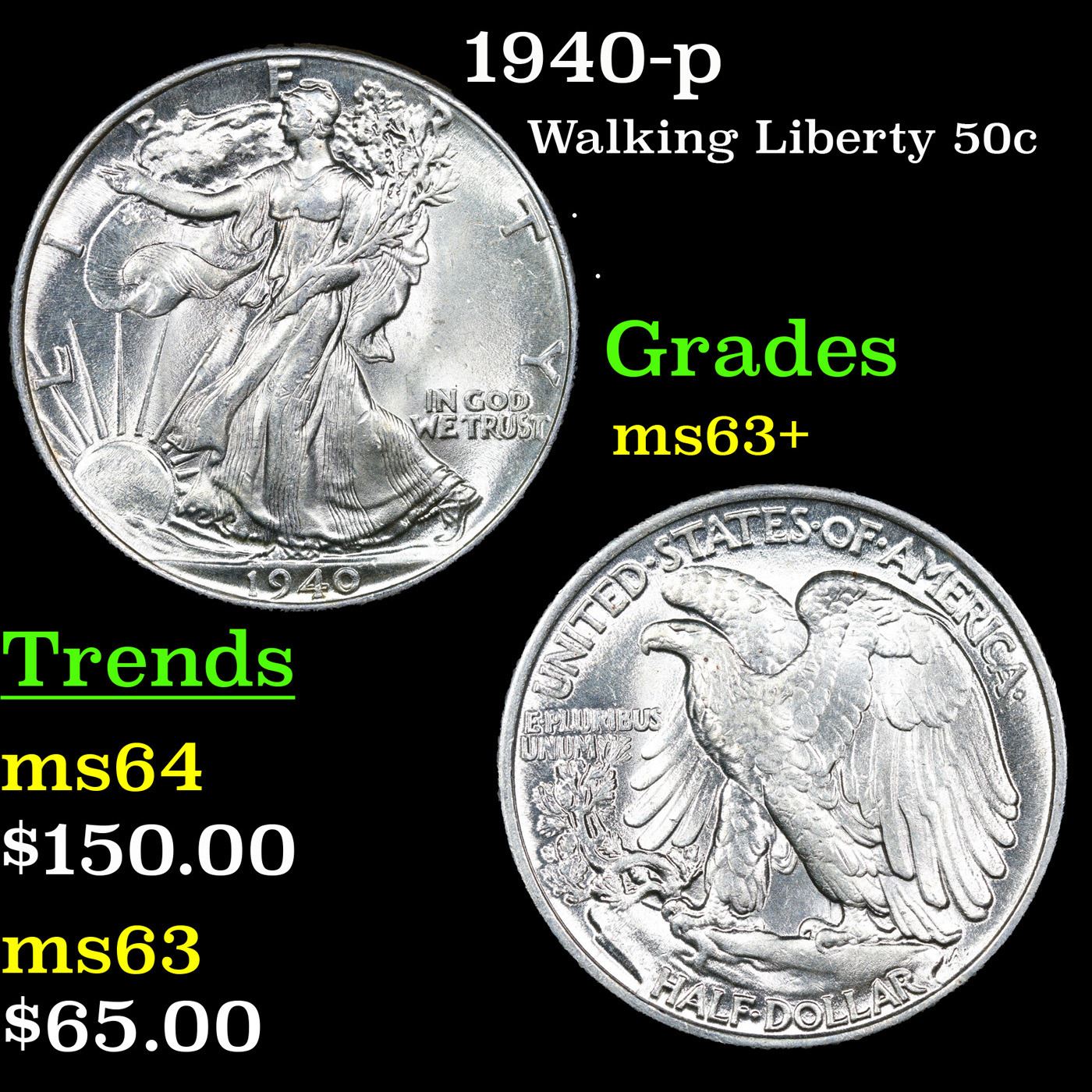 1940-p Walking Liberty Half Dollar 50c Grades Select+ Unc.