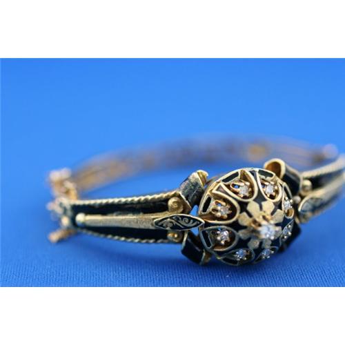 Great 1940's glamourous bracelet. a sculptural top is detailed with black enamel and crowned with a sparkling 10pt diamond. The back is detailed with lovely filigree. The bracelet has a safety chain and a hinge-safety clasp. There is some small wear to the enamel, visible in the photos, is in very good condition with a working hinge and clasp. It's internal dimensions are 2" X 2 3/8". At it's widest, at the front, it is 7/8" wide and graduates to about a quarter inch at the back. It weighs a substantial 21.4 grams.