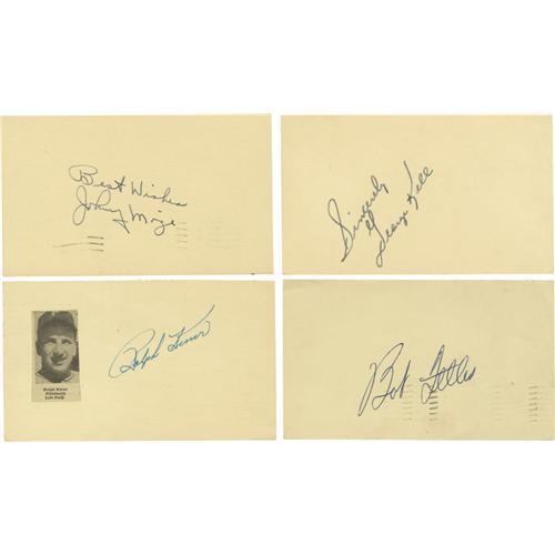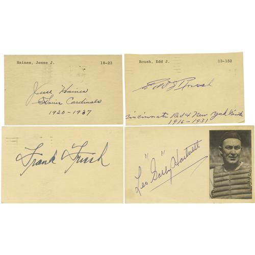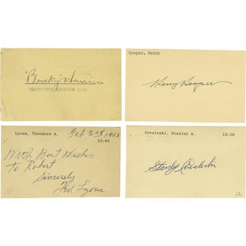 <B>1940's-50's Hall of Famers Signed Government Postcards Lot of 15.</B></I> Not a single autograph dips below a quality of 9/10 in this fine assortment of mailers from the best in the game to the collectors of old. Present in this lot are the following: Roush (with notation), Haines (with notation), Lyons (personalized), Frisch, Roberts, Appling, Boudreau, Mize, Kiner, Feller, Kell, Coveleski, Hooper, Harris, Hartnett. A terrific lot for dealers and collectors. <I>LOA from PSA/DNA. LOA from James Spence Authentication.</B></I><BR><BR><b>Shipping:</b> Sportscard (<a target="_blank" href="http://www.heritageauctions.com/common/shipping.php">view shipping information</a>)