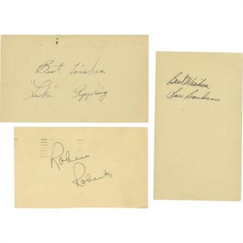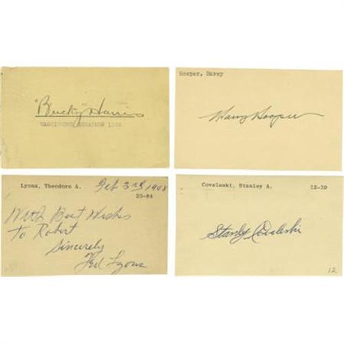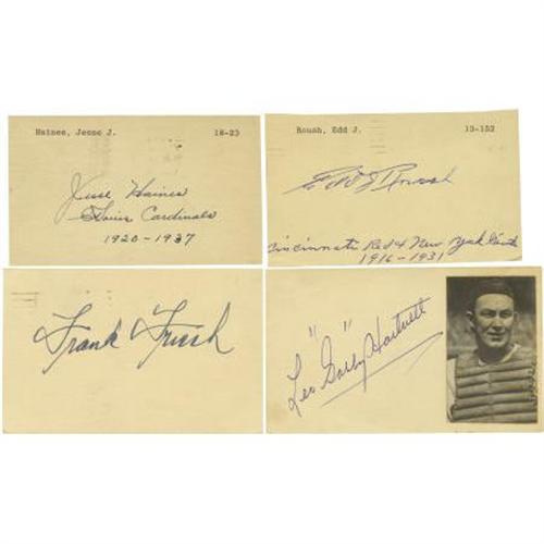 <B>1940's-50's Hall of Famers Signed Government Postcards Lot of 15.</B></I> Not a single autograph dips below a quality of 9/10 in this fine assortment of mailers from the best in the game to the collectors of old. Present in this lot are the following: Roush (with notation), Haines (with notation), Lyons (personalized), Frisch, Roberts, Appling, Boudreau, Mize, Kiner, Feller, Kell, Coveleski, Hooper, Harris, Hartnett. A terrific lot for dealers and collectors. <I>LOA from PSA/DNA. LOA from James Spence Authentication.</B></I><BR><BR><b>Shipping:</b> Flat Material, Small (<a target="_blank" href="http://www.heritageauctions.com/common/shipping.php">view shipping information</a>)