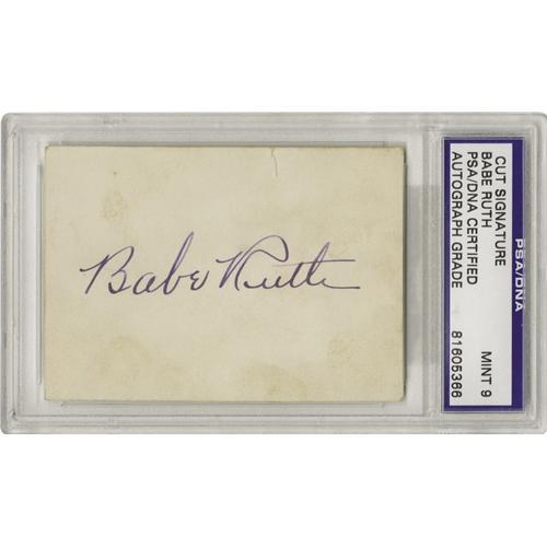 <B>1940's Babe Ruth Signed Cut Signature, PSA Mint 9.</B></I> The strict grading standards of PSA/DNA are made abundantly clear here as we find this terrifically bold autograph from baseball's greatest name achieving a score of only Mint 9 on a ten point scale. The clipped 2.5x3.5" slip of blank paper upon which the signature appears shows light age toning, but nothing that could begin to diminish the exceptional visual power. Encapsulated by PSA/DNA for protection and unquestioned authenticity.<BR><BR><b>Shipping:</b> Sportscard (<a target="_blank" href="http://www.heritageauctions.com/common/shipping.php">view shipping information</a>)