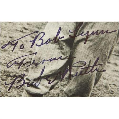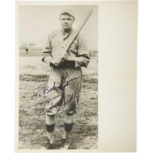 <B>1940's Babe Ruth Signed Photograph in Boston Red Sox Uniform.</B></I> While the authenticators claimed that they could recall at least one other example of a Babe Ruth signed image in a Red Sox uniform, they were fairly confident that they had yet to encounter one of the Home Run King to be with a bat in his hands. The same certainly holds true for us here at Heritage, and we expect our most educated bidding clientele to understand what an exceptionally rare opportunity this offering presents. We readily note that both the print and the blue fountain pen inscription date to the later years of the Babe's life, though this later production date is largely to thank for the remarkable 9+/10 boldness of the "To Bob Lynn From Babe Ruth" inscription and the equally fine condition of the photo itself, printed upon an 8x10" sheet of photographic card stock. Clearly one of the most intriguing Ruth autographed pieces to come to market in 2008, this should set off a bidding war between Boston and New York residents almost as fierce as the Red Sox/Yankees rivalry itself. <I>LOA from James Spence Authentication.</B></I><BR><BR><b>Shipping:</b> Flat Material, Small (<a target="_blank" href="http://www.heritageauctions.com/common/shipping.php">view shipping information</a>)