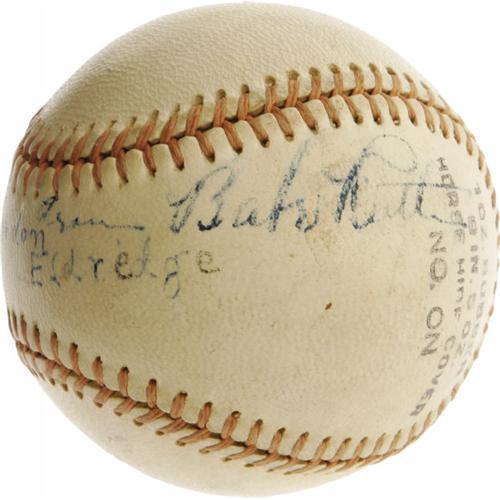 <B>1940's Babe Ruth Single Signed Baseball.</B></I> Place this signature on the sweet spot of an Official American League baseball and the price rockets upward to the $20,000 range, making this "Harwood National League" ball an attractive alternative for those collectors unwilling to break the bank. We'll rate the autograph a conservative 7/10, though we must note that a personalization in another hand appears just to the left. As our catalog photography should illustrate, however, the ball can quite easily be displayed so as to make this personalization all but invisible. Original though rather worn box is included. If a nice autograph is the most important factor for you when considering the purchase of a Ruth single, you're in the right place. <I>LOA from PSA/DNA.</B></I> <BR><BR><B>Important notice:</B> Heritage usually auctions material at the rate of 200-250 lots per hour. On some occasions eBay Live bid software or the Internet may not be able to keep up with the pace of the auction. We recommend placing a realistic absentee bid now as insurance to avoid disappointment. Occasionally the auctioneer may eliminate or reject an eBay Live bid, and the auctioneer may also reopen a lot after the close of the eBay live bidding (usually because we missed an audience bid), and may reject your bid even if it shows you as the winning bidder. By bidding via eBay Live, you agree that Heritage may award the lot to another bidder at its sole discretion under the circumstances described above or any other reasonable circumstances. Since eBay bids are not shown to us until we open the lot on the floor, we treat those bids just like floor bids. In most cases the floor responds before the eBay bid is presented to us, due to Internet lag time, so for consistency we have made it a policy that floor bids are always considered first over tie eBay live bids. Also please note that all Heritage lots purchased through eBay Live carry a 22.5% Buyer's Premium. Please make sure you read the Terms and Conditions before you bid. This lot is being auctioned in conjunction with a live floor auction by Heritage Galleries & Auctioneers. All final auction and invoice information will be supplied by Heritage Galleries & Auctioneers, and all other information should be considered preliminary. Lot:19016 <BR><BR><B>Winning Notification and Billing:</B> After the FINAL session in this auction is complete, Heritage will send e-mail and snail mail invoices. This process normally takes several days. All final auction and invoice information will be supplied by Heritage Galleries & Auctioneers, and all other information should be considered preliminary. <BR><BR>This auction will be conducted on a live auction floor and over the Internet through eBay Live. If you choose to place an absentee bid, please take a moment to <font color='#0000ff'><u><a href='http://pages.ebay.com/liveauctions/help/before/laabsentee.html'>learn how eBay Live absentee bidding works</a></u></font><font color='#000000'>