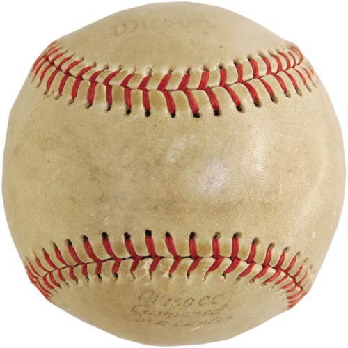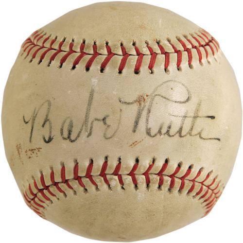 <B>1940's Babe Ruth Single Signed Baseball.</B></I> The Bambino makes full use of the sweet spot of this "Wilson" brand ball, registering one of the largest Ruth signatures you'll find on horsehide. The bold black fountain pen ink has mellowed only slightly through the passing decades, rating an impressive 8.5/10 today. A few scattered spots of toning around the signature present absolutely no cause for concern, and are mentioned purely for accuracy's sake. Our catalog imagery should illustrate that the ball presents magnificently, certainly comparable to those Ruth singles realizing tens of thousands of dollars on the auction block. <I>LOA from PSA/DNA.</B></I>