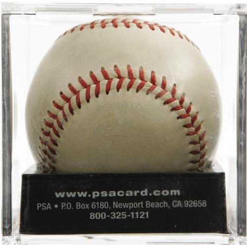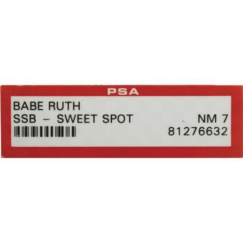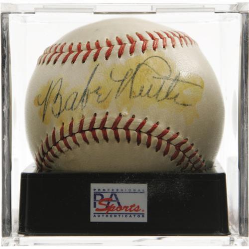 <B>1940's Babe Ruth Single Signed Baseball, PSA NM 7.</B></I> An enormous and marvelously bold blue fountain pen sweet spot signature on an OAL (Harridge) ball makes this a dream piece for legions of baseball autograph collectors. While its true that the coating of shellac that covers the Bambino's autograph has yellowed over the passing decades, we must give it the lion's share of credit for maintaining the fantastic strength of the autograph. The graders at PSA, notoriously tough with their standards, applied a subgrade of 8/10 for the signature, though we'll refer you to our catalog imagery and see if you agree with our contention that the score is very conservative. A grade of 7/10 for the baseball itself accounts for the final score as listed. <I>LOA from PSA/DNA. LOA from James Spence Authentication.</B></I><BR><BR><b>Shipping:</b> Balls, Pucks, etc., Small (<a target="_blank" href="http://www.heritageauctions.com/common/shipping.php">view shipping information</a>)