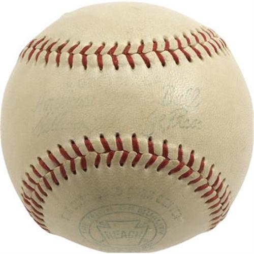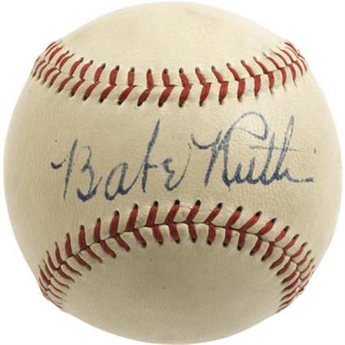 <B>1940's Babe Ruth Single Signed Baseball.</B></I> The components of an ideal Ruth single are as follows: first, the autograph must be rendered in bold ink upon the sweet spot. Second, the ball should be of Official American League breed. And, finally, that OAL ball must be pale and unblemished, with no distracting staining or scuffing. You may use this offering as a point of reference, providing all of the bells and whistles that knowledgeable collectors crave. The blue fountain pen used to craft this enormous Bambino autograph rates a solid 9/10, and the sphere dating from the A.L. presidency of William Harridge is as clean as the proverbial whistle. From the viewpoint as sports collectibles as a commodities market, the high-grade Ruth single has been the equivalent of Microsoft stock, solid as bedrock with a consistent upward trend. Consider this purchase simply wise portfolio diversification. Few bets are any safer. <I>LOA from PSA/DNA. LOA from James Spence Authentication.</B></I><BR><BR><b>Shipping:</b> Balls, Pucks, etc., Small (<a target="_blank" href="http://www.heritageauctions.com/common/shipping.php">view shipping information</a>)