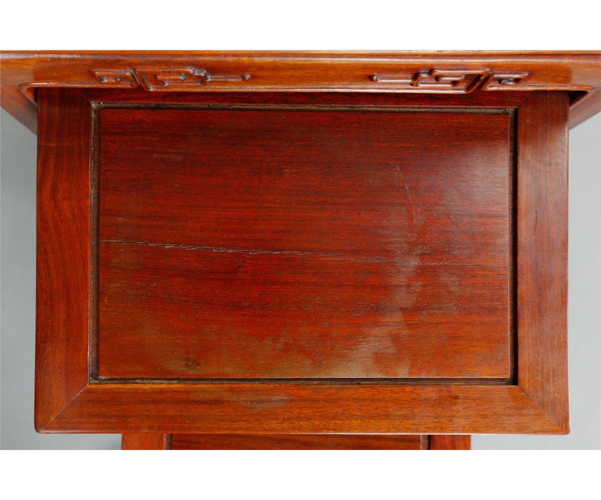 A nest of four Chinese Huali rosewood occasional tables with glass tops; each with a rectangular top and aprons with carved geometrical designs; Largest: H: 66 cm, W: 35.6 cm, L: 50.8 cm
