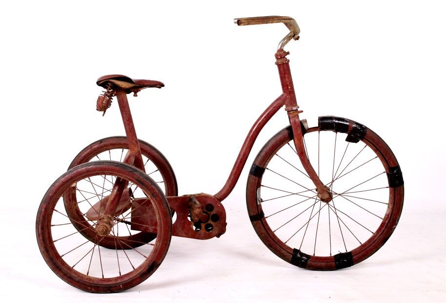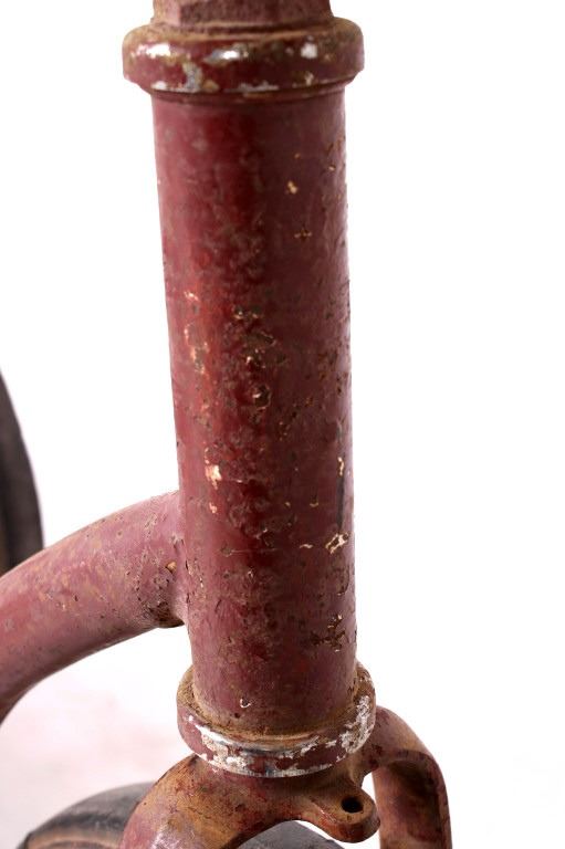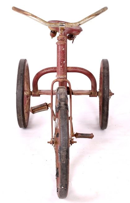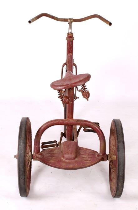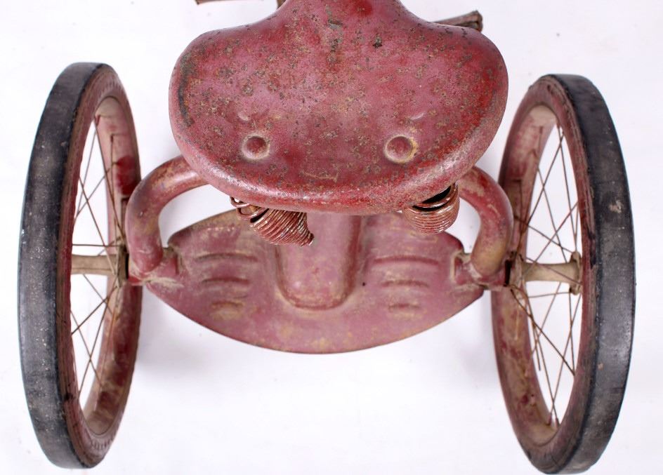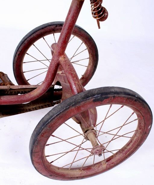 For your consideration is this 1940's Colson chain-driven tricycle. The Colson company started in the in the 1880's when Winslow Fay started making bicycles in Elyria, Ohio. Fay Manufacturing also produced tricycles marketed especially for handicapped adults, selling them under the name "Fairy". Fay sold the company in 1891. In 1917 Fay Manufacturing, Fairy, and Worthington were separate companies owned by one person and producing similar or compatible products. The companies were merged into one and renamed "Colson" for Fred Colson, the salesman responsible for the merger. It was in 1917 that Colson augmented its tricycle line-up with more models and sizes. This 1940's tricycle boasts chain drive, semi-Pneumatic Goodyear Tires, a back plate for standing and a spring-loaded saddle. The trike appears to have been repainted but is otherwise all original and has good "bones". It is missing the front fender, head badge and handle grips. A seat repair or replacement and a new front tire are all that would be needed for complete functionality. The tricycle measures about 47" in length, is 32" high, and is 19.5" wide. It has 16" back wheels and a 20" front wheel.