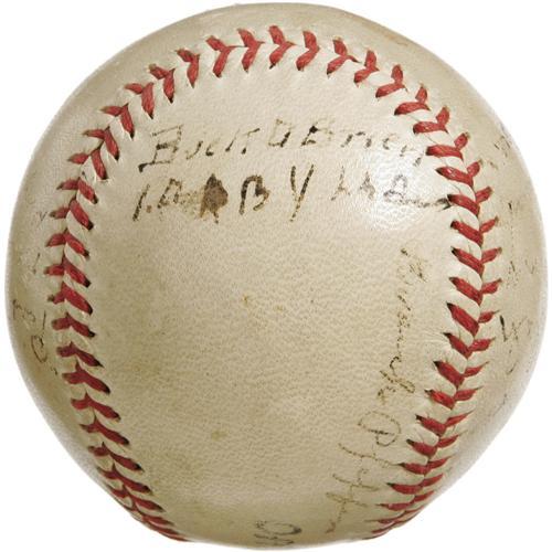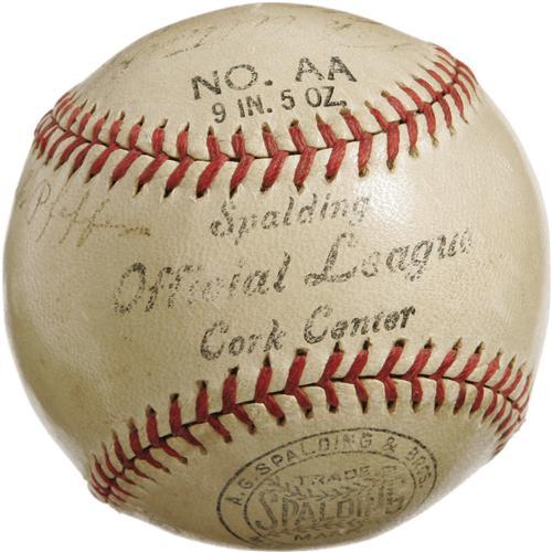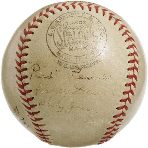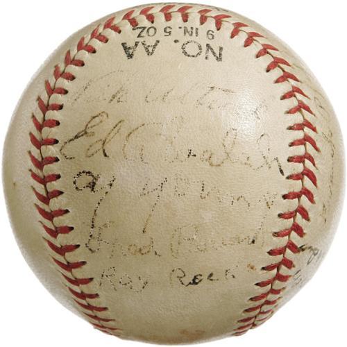 <B>1940's Cy Young & Ed Walsh Signed Baseball.</B></I> A lucky set of circumstances finds these two Dead Ball legends paired on a side panel, offering exceptional displayability for the cultured collector. We haven't been able to crack the case as to what event spawned this "Spalding Official League" ball signed by eleven mainly early century ballplayers, but we sure wish we could have been there. Also here is Fred Parent, who shared a dugout with each Hall of Famer during his career, and the ubiquitous Nick Altrock. Signature quality ranges from 2/10 to 6/10, with the Cooperstown residents at the top end of the spectrum. <I>LOA from PSA/DNA. LOA from James Spence Authentication.</B></I><BR><BR><b>Shipping:</b> Balls, Pucks, etc., Small (<a target="_blank" href="http://www.heritageauctions.com/common/shipping.php">view shipping information</a>)