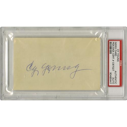 <B>1940's Cy Young Signed Index Card.</B></I> An autograph that's as big a winner as the man who signed it, the Hall of Fame legend who earned 511 victories in his playing career. The boldest 10/10 blue ink rendered this signature on the blank side of a 3x5" index card. Encapsulated by PSA/DNA for protection and unquestioned authenticity.<BR><BR><b>Shipping:</b> Sportscard (<a target="_blank" href="http://www.heritageauctions.com/common/shipping.php">view shipping information</a>)